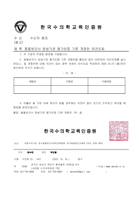 농림축산식품부로부터 동물보건사 양성기관 평가인증 업무를 위탁받은 한국수의학교육인증원에서 「평가인증 기준 개정(안)」에 대한 의견 조회를 요청하였습니다.[공문 참조]이번 개정(안)은 지난 9월 25일(수) 우송정보대학 공청회에서 논의된 내용을 반영한 것으로 확인되었습니다.